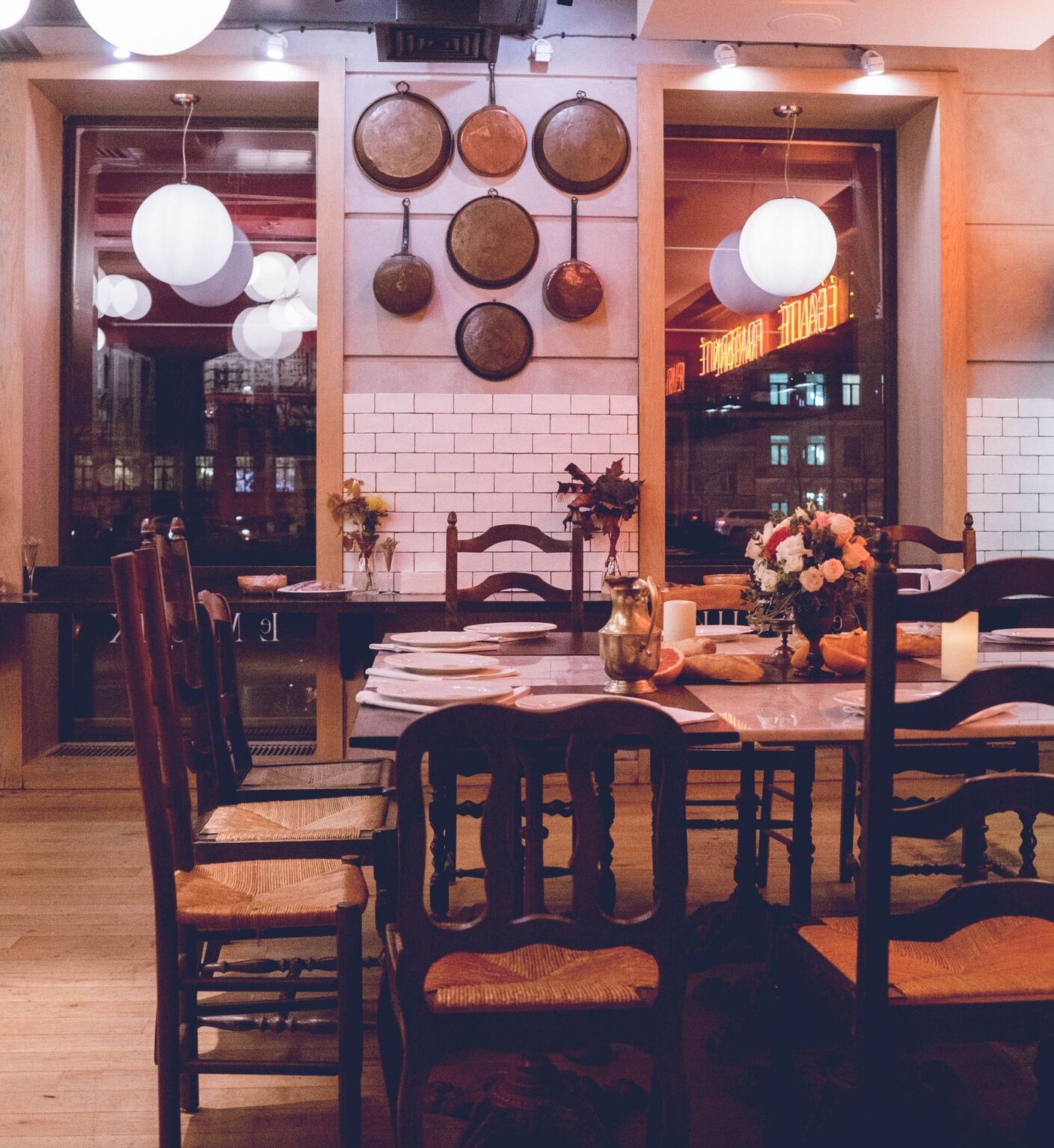 Накрываем один большой общий стол или несколько маленьких. За каждым — от 4 до 6 человек. В зале бистро комфортно размещается 50 гостей.