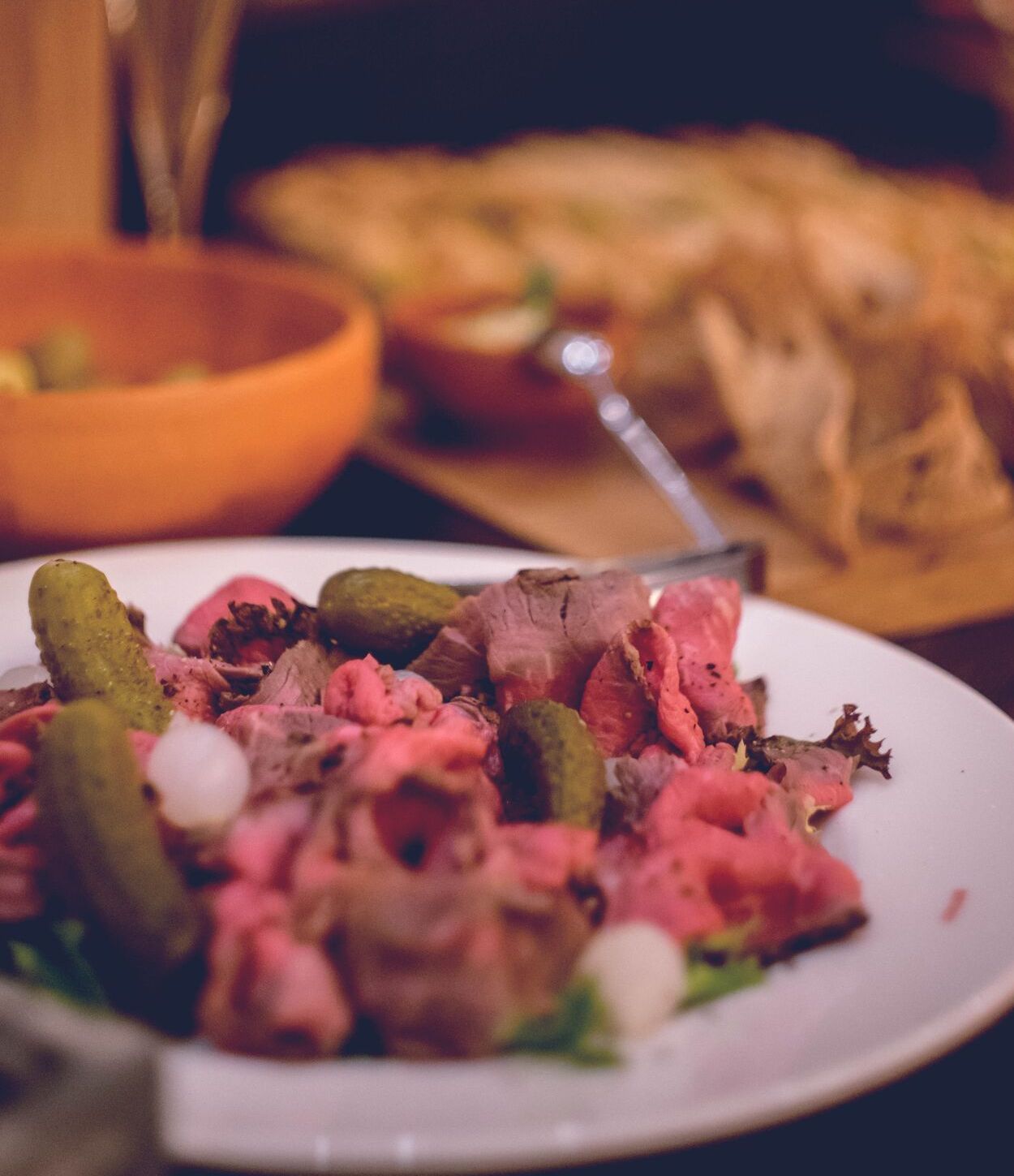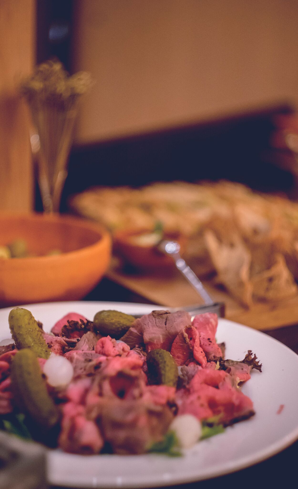 Ростбиф с корнишонами и жемчужным луком